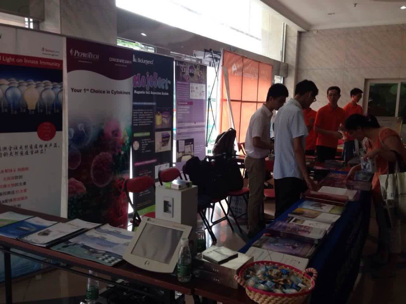 我司在A1號展臺,準備5副免疫殺撲克牌供展覽用,同時帶來公司的產品目錄冊以及免疫組(小彩圖:mechanisms of cell death,DC、巨噬細胞,中彩圖:Breg,Treg,th17)等資料以及細胞組的轉染、細胞治療組的PPT和儀器彩頁等資料供參會人員瀏覽,展臺的兩邊我們放置了多因子磁珠分選等3個易拉寶供參會人員看,技術部同事現場進行技術儀機器演示