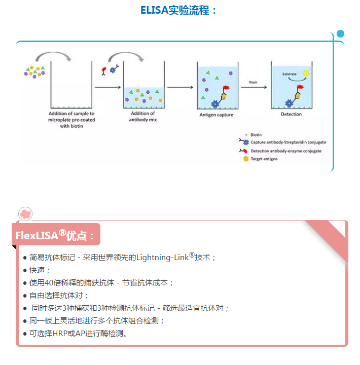 Innova Biosciences FlexLISA?主要是用于開發(fā)和優(yōu)化雙抗體夾心ELISA,將抗體對(duì)分別與Streptavidin和HRP/AP標(biāo)記,然后將樣本和標(biāo)記抗體對(duì)分別加入預(yù)包被Biotin 96孔板,室溫孵育1小時(shí),清洗后加入酶檢測(cè)試劑即可實(shí)現(xiàn)檢測(cè)。