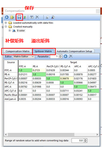 出現(xiàn)補償編輯欄,從PE通道中去除FITC的熒光信號,使PE通道的Mean/Median值與陰性細(xì)胞群一致。