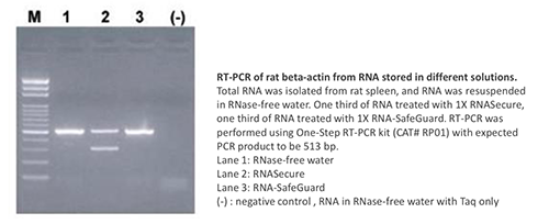 將RNA-SafeGuard Reagent (20X)用滅菌水稀釋成1X濃度,65°C反應20分鐘滅活水中、瓶中的RNase。剩余的1X RNA保存液