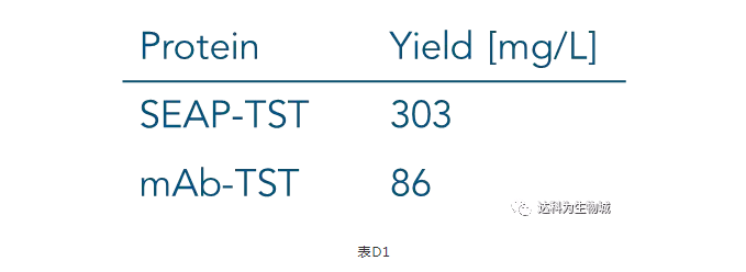 除了上述實驗所用的CHO細胞株外(中國倉鼠卵巢細胞),另一常用于生產(chǎn)蛋白的哺乳動物細胞株為HEK293(人胚胎腎細胞),使用上較CHO簡單。我們測試了Strep-Tactin?XT的純化表現(xiàn):表D1為以Expi293表達SEAP-TST或mAb-TST蛋白后,目標(biāo)蛋白的濃度。圖D2為純化表現(xiàn)的SDS-PAGE分析。從中可知,與ExpiCHO培養(yǎng)基相同,直接將表達好的Expi293上清加入1ml Strep-Tactin?XT高載量重力柱中進行純化,一樣能夠快速的得到高純度的目標(biāo)蛋白。