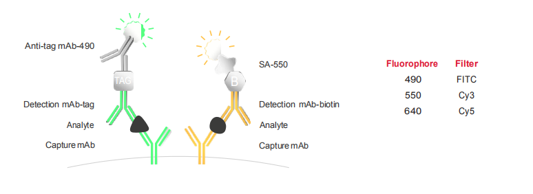 FluoroSpot能夠分析抗原特異性的多功能T細(xì)胞,例如,IFN-γ和IL-2的分析。三明治夾心結(jié)構(gòu)在熒光斑點(diǎn)中得以應(yīng)用,不同特異性的單克隆捕獲抗體混合物被包被于96孔板的PVDF膜上,生物素標(biāo)記的檢測(cè)抗體識(shí)別一種分泌物,tag標(biāo)記的檢測(cè)抗體識(shí)別其它的分泌物來(lái)實(shí)現(xiàn)雙色或三色細(xì)胞因子分泌細(xì)胞的檢測(cè)。檢測(cè)通過(guò)帶有特定熒光基團(tuán)的共軛試劑放大信號(hào)斑點(diǎn),可用自動(dòng)讀板器進(jìn)行分析。