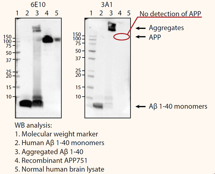 在WB實(shí)驗(yàn)中檢測(cè)克隆號(hào)3A1抗體針對(duì)人Aβ1-40單體、Aβ1-40聚集體、重組人APP751蛋白和正常人腦裂解物的特異性。與克隆號(hào)6E10抗體相反的是,3A1與APP無(wú)交叉反應(yīng)(泳道4、5)但是與Aβ1-40聚集體顯著反應(yīng)(泳道3)。與6E10相比,3A1表現(xiàn)出對(duì)Aβ1-40單體的較弱反應(yīng)性(泳道2、3)。