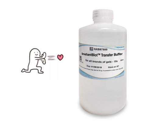 當然蛋白電泳只是WB實驗的第一步,那還有什么方法能加快后續實驗(如轉膜)進程呢?別急,今天就給大家介紹一款來自分子產品專家Expedeon公司的快速轉膜液——InstantBlot?Transfer Buffer貨號:NXB87500),作為Expedeon的一款專利產品,該轉膜液能夠大幅提升蛋白從“膠”至“膜”的轉移速度,最快只需10 min即可完成轉膜,并且不會產生過多的熱量,避免影響蛋白的后續檢測。
