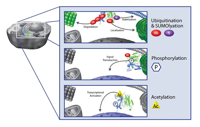 盡管目前已知的PTM的種類超過400但只有少數幾個被詳細研究過,主要包括甲基化、磷酸化、乙酰化、泛素化和SUMO化,它們被證明是幾乎所有細胞的關鍵調節因素,包括信號轉導、表觀遺傳學、基因和蛋白質表達、蛋白質穩定性和定位以及細胞免疫。