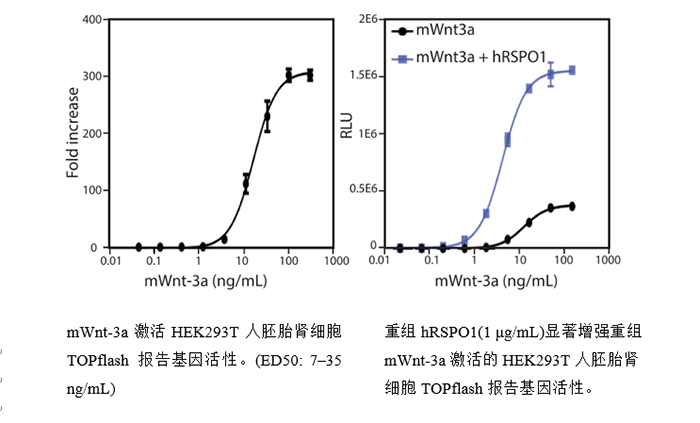 C3H10T1/2干細胞培養至細胞融合,使用BMP-9(20 ng/mL, Cat. No. 553102)和不同濃度的h/mSHH、或hDHH、或mIHH(Cat. No. 753502, 754602, 759802,758602)處理,將間充質干細胞誘導分化為成骨細胞。使用對硝基苯磷酸酯作為底物,檢測成骨細胞標記物堿性磷酸酶。
