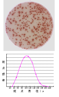 如果一次實驗中有兩類細胞同時受到刺激,比如T細胞與巨噬細胞,或者一次實驗中T細胞受到兩種不同的刺激物刺激,比如蛋白抗原與內毒素(大腸桿菌表達的蛋白很可能含有較高濃度的內毒素),那么同一個孔中就會出現兩種不同的斑點。這兩種斑點用肉眼很難區別,但是如果對它們直徑分布做統計作圖的話,就會有別于圖1.3中的單峰分布,而是呈現雙峰分布。