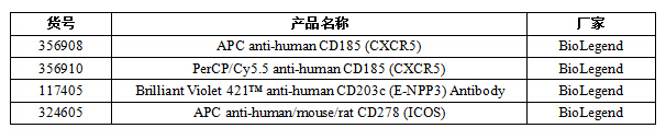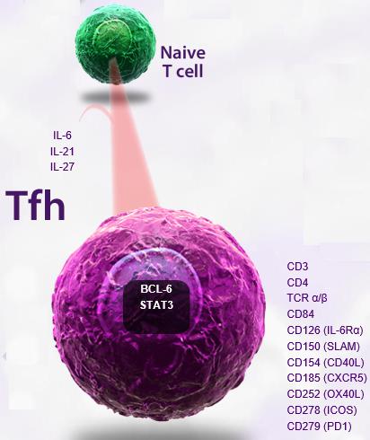 主要標記物:Tfh 細胞屬于 CD4+  T 細胞亞群,其表型特征為 CXCR5+CD40LhiICOShi ,并且還表達細胞因子 IL-21 和轉錄因子 Bcl-6 。 IL-21 和 Bcl-6 ( B-cell  lymphoma  6 對于 Tfh 細胞的發生和發育至關重要。其中 IL-21 誘導 Tfh 的分化并促進其表面 CXCR5 的表達; Bcl-6 對于 Tfh 轉移到淋巴濾泡和 B 細胞發生中心( Germinal  center 的形成必不可少。