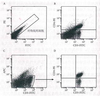 雖然死細胞位于散點圖的對角線上,但是對角線上的細胞確不一定是死細胞,因為雙陽性細胞如果在x軸和y軸的熒光信號相似時,也可以位于對角線上。所以,散點圖對角線上的細胞可能是死細胞,也可能是雙陽性細胞。如圖1-B所示,樣本細胞為正常小鼠脾臟細胞,標記 FITC-抗CD3抗體和PE-抗CD4抗體,FITC和PE雙陽性的CD4 T細胞和死細胞混在一起,無法區分。但是死細胞和雙陽性細胞的形狀是不一樣的,死細胞呈現連續的線型分布,而雙陽性細胞群呈現圓形的群體分布,因此,可以從對角線上的細胞群體的形狀大致判斷細胞的性質。雖然不能根據熒光強度的強弱來區分該熒光信號是來自于死細胞的非特異性熒光還是來自熒光素產生的熒光,但是可以利用在散點圖上死細胞位于對角線的特點來區分死細胞和陽性活細胞。如圖1-C所示,x軸表示FITC通道(樣本細胞標記有FITC-抗CD3抗體),y軸表示APC通道(閑置通道),借用該散點圖可以明確區分圖1-B中無法區分的死細胞和雙陽性細胞。此時只需要將排除了死細胞后的CD3 T細胞設門,將門內的細胞顯示于新的FITC-PE散點圖中,如圖1-D,此時該散點圖內的細胞都是活細胞,因為樣本細胞同時標記有PE-抗CD4抗體,所以圖中的細胞明顯分為兩群,雙陽性的是CD4T細胞,單陽性的是CD8 T細胞。