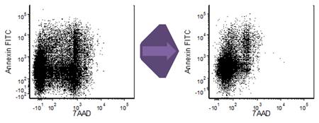 圖為:體外培養一天的C57BL/6小鼠脾細胞做Annexin V/7-AAD染色的流式數據。其中,左邊為未經固定處理的細胞上機檢測結果; 右邊為經過70%EtOH, 1.5%PFA固定處理的細胞上機檢測結果。