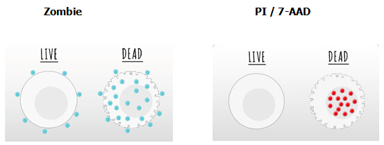 Zombie Dyes有別于PI和7-AAD等DNA染料,它是一種可用于需固定細胞實驗的染料,通過與細胞上蛋白質的氨基結合來實現。因活細胞可排除染料,所以僅細胞膜被著色;而死細胞的細胞膜及細胞質均被著色,繼而根據熒光信號的強弱來區分死/活細胞。而且Zombie Dyes可選擇性多,可以由不同的激發光激發,便于靈活選擇。