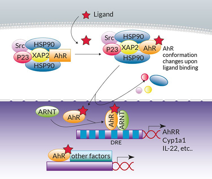 典型AhR訊號已經被廣泛綜述過1。簡而言之,在沒有配體的情況下,AhR位于細胞質中Hsp90:XAP2:p23:Src伴侶蛋白復合物內,當配體結合時,復合物發生構象變化并轉移到細胞核中。伴侶蛋白被釋放,AhR和AhR核轉位子(ARNT)異源二聚。在細胞核中,AhR:配體:ARNT三聚體與AhR靶基因上游調節區域的二噁英應答元件(DRE)結合,以控制包括細胞色素P450依賴性單加氧酶Cyp1a1、AhR 抑制因子(AhRR)和IL-22白細胞介素的轉錄。值得注意的是,無輪是在基因組水平上通過與其他轉錄因子(例如NF-κB)相關聯,還是在非基因組水平上(例如通過釋放Src激酶),非典型AhR信號通路也有被報道過2,3。