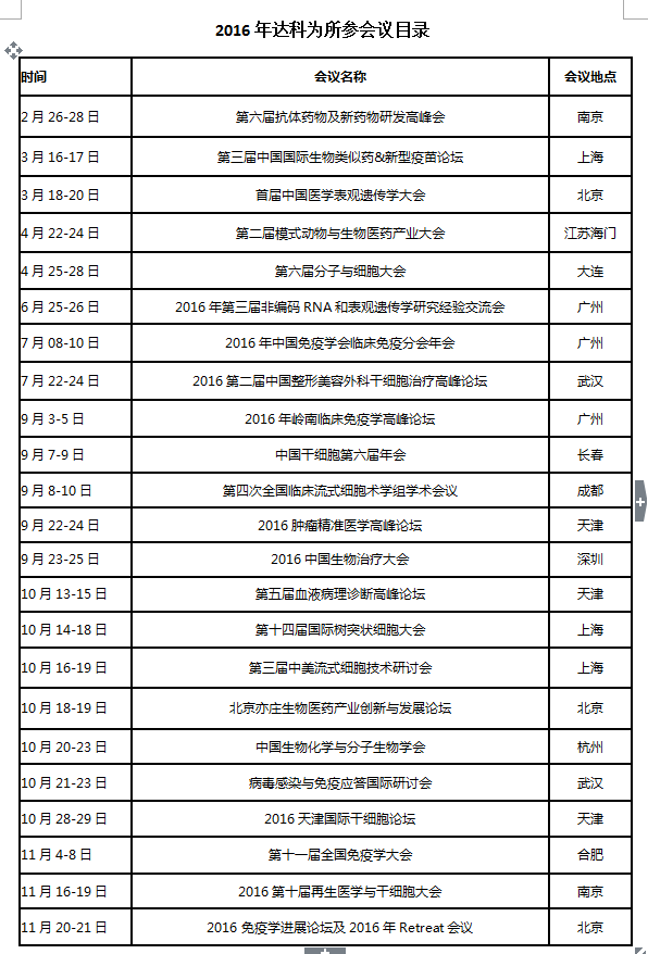2016年達科為生物技術(shù)有限公司參展會議列表